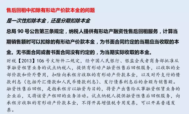 90號公告第三條規(guī)定,納稅人提供有形動產(chǎn)融資性售后回租服務(wù),計算當(dāng)期銷售額時可以扣除的有形動產(chǎn)價款本金,為書面合同約定的當(dāng)期應(yīng)當(dāng)收取的本金。無書面合同或者書面合同沒有約定的,為當(dāng)期實際收取的本金。