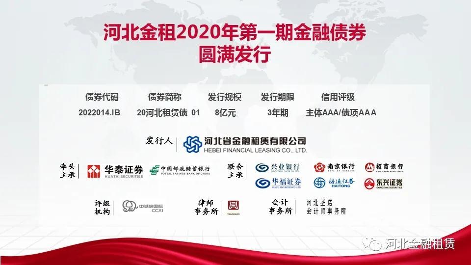 日前,河北省金融租賃有限公司(以下簡稱“河北金租”)2020年第一期金融債券成功發(fā)行,發(fā)行規(guī)模8億元,期限3年。此次河北金租發(fā)行的金融債券場內(nèi)認(rèn)購倍數(shù)達(dá)到2倍,投資人認(rèn)可度較高,債券所募資金將主要用于清潔能源、節(jié)能環(huán)保、醫(yī)療健康等公司戰(zhàn)略行業(yè)項(xiàng)目投放,同時(shí)積極助力新冠肺炎防控,為防疫醫(yī)療設(shè)備商和服務(wù)商、新冠疫情定點(diǎn)醫(yī)療機(jī)構(gòu)提供金融服務(wù),支持湖北等地區(qū)公共事業(yè)及工程裝備制造等行業(yè)發(fā)展。