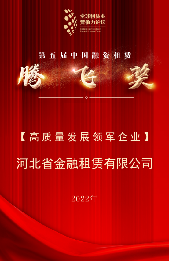 日前,第九屆全球租賃業(yè)競爭力論壇年度峰會圓滿召開,河北省金融租賃有限公司(以下簡稱“河北金租”或“公司”)再度攬下中國融資租賃“騰飛獎”,榮獲“高質量發(fā)展領軍企業(yè)”榮譽。全球租賃業(yè)競爭力論壇峰會是一年一度的世界級租賃行業(yè)峰…